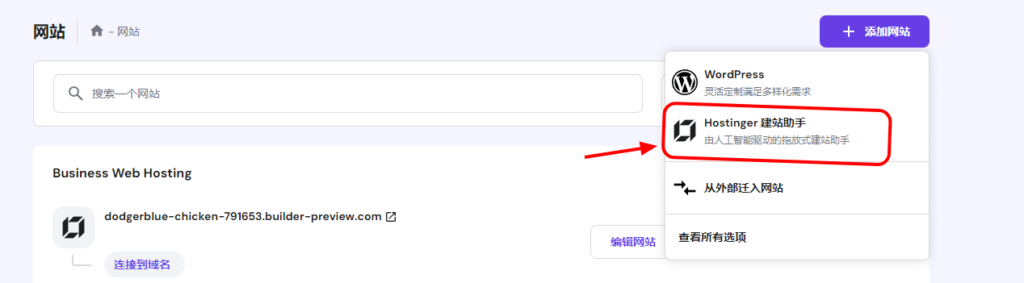 到hostinger后台之后,选择网站页面,点击添加网站,选择 Hostinger 建站助手教