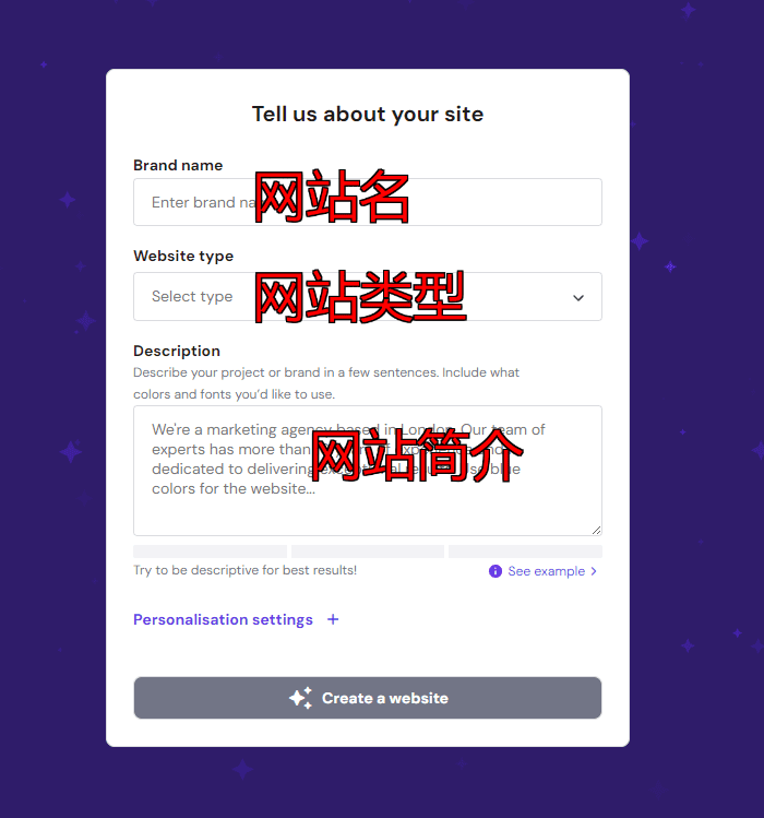 网站简介,有时写中文,AI是不能生成,如果不能可以先换英文,之后是可以更改的。
